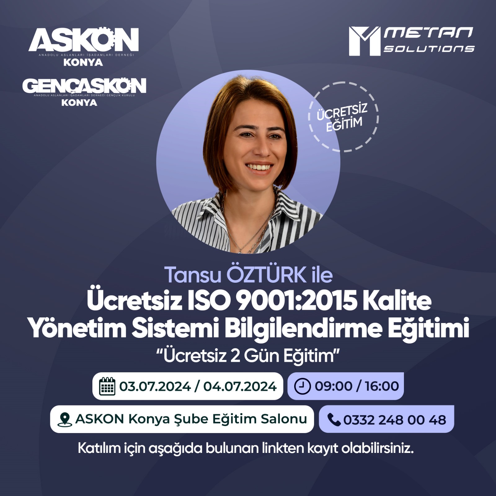 Anadolu Aslanları İş Adamları Derneği (ASKON) Konya Şubesi ve Metan Solutions iş birliği ile ASKON Konya Şubesi’nde ISO 9001 : 2015 Kalite Yönetim Sistemi Bilgilendirme Eğitimi yüzyüze olarak gerçekleştirildi.